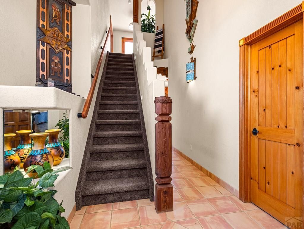 Live the Colorado dream in this stunning Spanish Mediterranean-inspired custom home on 2.18 acres with mountain and lake views near Pueblo State Park. This 3-bed, 3-bath, 3,669 sq. ft. home blends style, space, and comfort. Vaulted ceilings, hardwood & tile floors, granite counters, skylights, and two gas fireplaces create a warm, inviting space. The main level features a bedroom and full bath, open living and dining with French doors to the enclosed courtyard with hot tub, and a fully equipped kitchen. Upstairs, the primary suite offers a spa-like 5-piece bath, jetted tub, walk-in closet, flex room, and private balcony with breathtaking views. The finished lower level adds a guest bedroom, 3/4 bath with steam shower, dry bar, family and game rooms, plus ample storage. A heated 4+ car drive-through garage provides space for boats, RVs, or a workshop, with ample parking for all your toys and guests. Pueblo West acreage retreatâ??perfect for entertaining, relaxing, and living the Colorado lifestyle.