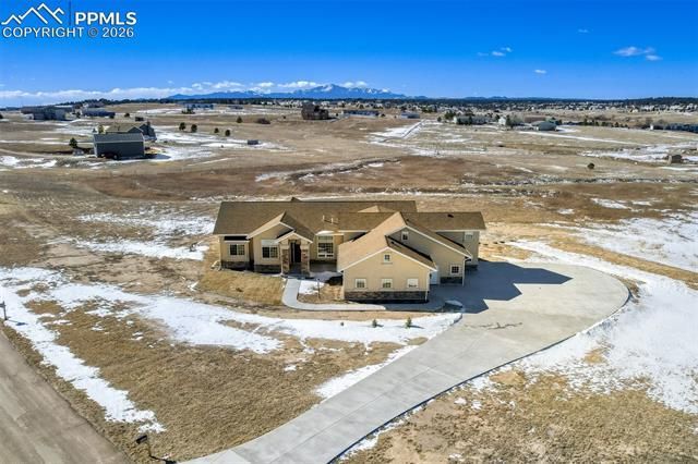 Welcome to this stunning Black Forest home located on 5 acres in a highly desirable subdivision two lots up from county-maintained walking/riding trails, plus easy access to additional trails throughout the area. 5-6 beds total/4 baths/6 car garage on five acres. Soaring 14-foot ceilings & expansive 10-foot ceilings throughout, creating an open/airy feel. The living room features a dramatic wall of windows, gorgeous lighting, + beautiful indoor/outdoor fireplace w/custom mantel—perfect for both everyday living and entertaining. The home offers a true cook’s kitchen w/massive granite island, along w//separate secondary prep/cook island area includes double sinks, separate ice maker, wine fridge, custom appliances, & stunning sinks & faucets. Adjacent to the kitchen is a formal dining area filled with natural light and accented by an eye-catching coffered ceiling. An additional room on the main level can serve as an office, bonus room, or extra bedroom & features beautiful tray ceiling and closet. The main level also includes a full bath with quartz countertops.2 bedrooms share a Jack-and-Jill bathroom w/views, double sinks, quartz countertops, & custom cabinetry. On opposite end of home, a luxurious primary suite offers privacy & comfort, featuring striking stone fireplace, spa-like bathroom w/ gorgeous walk-in shower w/ dual shower heads, a freestanding tub, custom leathered granite countertops, and a spacious walk-in closet. The primary suite connects conveniently to the laundry room, which includes a washer and dryer that remain with the home, along with leathered granite countertops. From there, enjoy easy access to the 40x48, insulated garage w/2 stubbed gas lines, fits 6 cars and/or Class C w/sewer dump just outside. Double staircases lead to an expansive basement with complete kitchen, 2 bedrooms & bath, massive great room along w/storage or 7th bed & 5th bath option. Basement has own entrance, perfect for multigenerational living. Unbelievable opportunity!