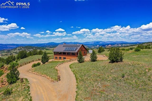 Custom home "on top of the world" w/ 10 acres, views in every direction of the Sangre de Cristos, Wet Mountains, Collegiate Peaks, Pikes Peak & surrounding mtn ranges. 100% solar home w/ 2 types of solar, Photovoltaic & Solar Thermal Systems! Completely automated systems to cycle upon your energy needs! NEVER have a POWER OUTAGE or BLACKOUT FROM THE ENERGY COMPANY AGAIN! Energy costs just a few $ per yr for propane! Home has 3600 sf of enclosed space including 820 sf wraparound sunroom deck with custom roll-up garage door windows bringing the outdoors in! Living area features vaulted aspen T&G ceilings overlooking a wood-burning fireplace. The adjacent dining area walks out to the glass sunroom w/ views streaming in! Entire home is done in solid Oak cabinetry, kitchen has black energy efficient appliances, double oven, & pantry closet. Expansive main floor owners suite offers a walk-in closet & en-suite 3/4 bath, + attached powder room accessed from the hall for guests. LL cozy family room incl. a wood-burning stove & 2 additional bedrooms, served by a full bath. Bonus sunroom situated adjacent the family room, suitable for an office/exercise room. Upgraded features: 6” insulated walls; R-48 insulation in the attic; tile flooring throughout w/ "radiant in-floor" heat; 36” width ADA accessible solid 6 panel Oak doors; Energy Star rated appliances & windows; 8 solar tubes throughout both levels encapsulating the sun; high efficiency ultramodern solar components; solar thermal collection & distribution system; 6 LFP batteries; boiler backup high efficiency propane heating system; Kohler generator; heated & finished garage; 8'x26' storage container; two 1500 gal H2O storage tanks for fire mitigation/protection; stucco exterior; heavy gauge steel roof; completely fire mitigated w/ "hand placed" riprap rock xeriscaping; 5 minutes to Cripple Creek for entertainment! Great cellular coverage & unobstructed high speed broadband internet & satellite TV. Addt'l 11 acres avail.