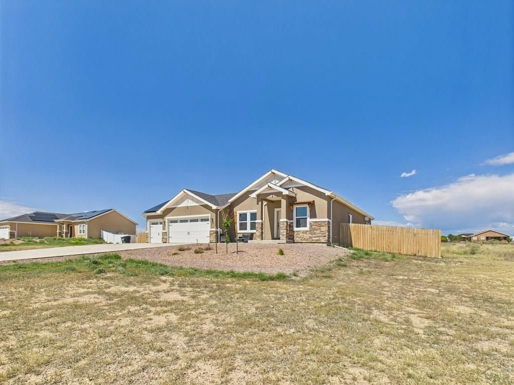 Step into this welcoming 3-bedroom, 2-bathroom, 3-car garage treasure, nestled in the northern part of Pueblo West. Being less than 5 minutes from I-25, this home is perfect for commuting to Fountain and Colorado Springs. Spanning across over 1600 square feet, this striking single-story home perfectly balances comfort and elegance. The spacious kitchen is equipped with granite countertops, stainless-steel appliances, walk-in pantry, and an abundant amount of cabinetry. The open floor plan makes hosting dinners easy and accessible. The Primary Bedroom features double doors, large windows, a full bathroom with walk-in shower, and a spacious walk-in closet. A laundry closest in the hallway completes the interior. Outside, enjoy the massive fenced-in backyard (not including the full 1 acre), solar panels, and a fully paved driveway. Don't wait, transform your lifestyle today. This home just might be the dream space you've been hunting for!