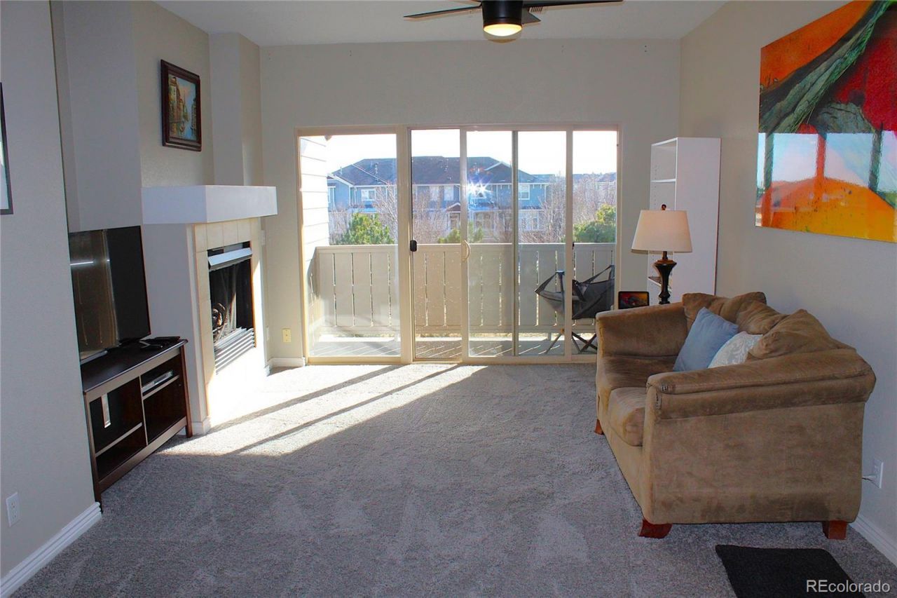 Spacious 2 bedroom, 2 bathroom penthouse level condo unit in a great community! Excellent location with ample winter sun and light offering a superior south facing view of the Stonegate Guell Park area. Open floor plan featuring an outstanding kitchen with 42 hardwood cabinets, sliding shelf organizers, center island offering an extended counter top for breakfast nook, ample counter space for those gourmet cooks, tile backsplash, all black Maytag appliances including refrigerator, dishwasher, microwave and stove. Extra space with pantry closet shelving. The large dining area will be great for family get togethers, adjacent to the kitchen and also has a built-in desk for convenience. Large double coat closet for additional storage. The living room features a ceiling fan, an electric fireplace and south facing balcony for ample sunlight and views. Engineered hardwood flooring through the main level with carpeting in both bedrooms. The primary bedroom is a true master suite with an expansive room, large bathroom with double sink vanity, large tile shower with seat and huge walk-in closet. Includes washer and dryer, air conditioning, ceiling fans and fire suppression and alarms with building. One car detached garage with reserve space allowed to park in the immediate driveway. Beautiful private pool and BBQ for Guell Condo residents only. Convenient location close to Jordan and E-470, shopping, Cherry Creek Trails and the town of Parker.