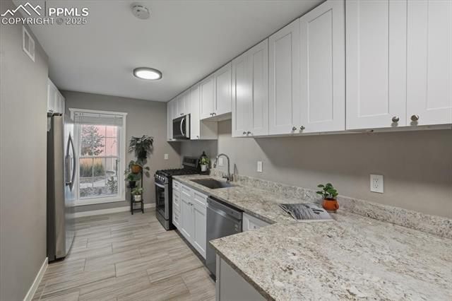 Welcome to this beautifully updated main-level 3-bedroom, 2-bath condo in Sierra Pointe, where a low-maintenance lifestyle truly shines—thanks to an HOA that covers all utilities, including water, gas, electric, and trash, along with lawn care and snow removal. Tucked into a quiet back corner of the community, this home offers exceptional privacy and a move-in-ready space filled with thoughtful updates and modern finishes. The functional layout maximizes every room, with a standout kitchen featuring granite countertops, modern shaker cabinets, a gas stove, and ample storage for all your cooking needs. Updated windows and a newer patio door flood the interior with natural light while improving energy efficiency, and central air conditioning ensures year-round comfort. The spacious living area opens to a private covered patio, perfect for morning coffee or unwinding in the evening, while washer and dryer hookups add everyday convenience. Both bathrooms have been tastefully updated with clean, modern fixtures that create a cohesive and inviting feel throughout. The well-maintained Sierra Pointe community also offers desirable amenities including a pool, clubhouse, and basketball court, ideal for recreation and social gatherings. A reserved carport provides convenient parking, and the location near Academy Boulevard offers quick access to shopping, dining, and major commuter routes, all while remaining peacefully tucked away within walking distance of Palmer Park. Whether you’re seeking a low-maintenance home, an investment opportunity, or a comfortable place to downsize, this updated condo delivers style, value, and privacy in one complete package.