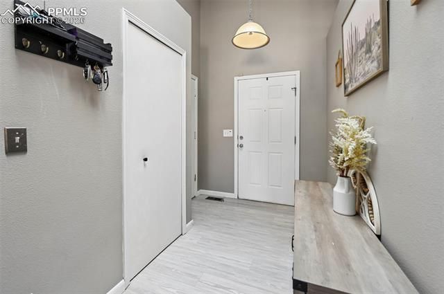 This well maintained, fully xeriscaped home has been thoughtfully updated recently with a brand new HVAC system including A/C and has brand new carpet throughout the main floor. The updated kitchen has a gas stovetop, corian countertops, SS appliances, and plenty of storage! The dining and living room are open concept with vaulted ceilings, an electric gas fireplace insert and access to the back patio. The primary bedroom has vaulted ceilings, a walk in closet and 5 piece bath. An additional bedroom and full bath are on the main. The basement boasts a large rec area, a wet bar with microwave, full size refrigerator and cabinetry. Around the corner find a large laundry room, storage space, two additional bedrooms and a 3/4 bathroom. This property is walking distance to Soaring Eagles Park, Soaring Eagles Elementary school, a quick drive to the COS airport, Peterson AFB, Ft. Carson, shopping and amenities. This location is all about convenience! Don't miss it!