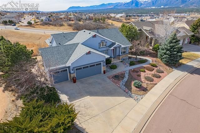 Beautifully maintained "Goetzmann-built walkout rancher" set on a gorgeously xeriscaped lot showcasing sweeping panoramic views from Pikes Peak to Cheyenne Mountain. Experience peaceful, country-inspired living with the convenience of nearby shopping, dining, and amenities just minutes away. A vaulted entry welcomes you with hardwood floors and a spacious main-level office with French doors, ideal for working from home or flexible living space. The formal dining room seamlessly connects to the eat-in kitchen featuring hardwood floors, custom cabinetry, center island, pantry, utility desk, and walk-out access to the deck—perfect for outdoor entertaining and enjoying Colorado’s breathtaking sunsets. The vaulted living room offers expansive windows framing mountain vistas and a gas brick fireplace creating warmth and ambiance. The main-level primary suite is a private retreat with deck access, walk-in closet, and luxurious 5-piece bath with soaking tub and glass block window for natural light and privacy. An additional main-level bedroom, full bath, and convenient laundry/mudroom with sink and built-ins provide functional ease, leading to the finished 3-car garage. Security system wired included. The bright walkout basement with 9’ ceilings feels open and inviting, featuring a large L-shaped rec room, wet bar, and covered patio access. A spacious lower-level bedroom with walk-in closet sits adjacent to a full bath, plus an additional bedroom. Oversized finished storage area offer excellent potential for storage or flex space and *Noncorming 5th bedroom/Exercise Room/Media room. Mature pine trees enhance privacy, with a greenbelt behind the home providing a sense of openness and no rear neighbors. Walking distance to Bear Creek Elementary; zoned for Lewis-Palmer and Palmer Ridge. Close to Santa Fe Trail, a neighborhood park, shopping, dining, banking, and the U.S. Air Force Academy.