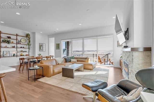 One of the best locations in The Canyons—backing to open space with peaceful views—this 4-bedroom, 4-bath home offers the space and flexibility you’ve been looking for. Step inside the foyer that leads to an open living and dining area with luxury vinyl flooring, a gas fireplace with stone-tile surround and warm wood accent, and oversized sliding doors that lead to a covered deck—perfect for morning coffee or sunset dinners. The gourmet kitchen is designed for gathering with ceiling-height custom cabinetry and crown molding, tile backsplash, stainless steel appliances, a gas cooktop, and a large center island with seating and a granite sink. A spacious walk-in pantry with built-in wood shelving keeps everything organized. The main-level primary suite is light and private, with custom carpet and serene views. The en-suite bath features tile floors, dual sinks, a large walk-in shower with a bench and privacy window, a separate water closet, and an oversized walk-in closet with built-ins. Also on the main level: a flex room (office/den/playroom), powder bath, and additional bedrooms with a full bath, plus a convenient mudroom/laundry with tile floors, shelving, and cabinetry. Downstairs, the walk-out lower level adds even more options—family room with large windows and a slider to the patio and backyard, an additional bedroom with French doors and room for an office/sitting area, a ¾ bath with a glass-door walk-in shower, plus access to unfinished storage. This incredible home backs to open space, has room to spread out, and a layout that fits real life. The Canyons is a new and highly sought-after neighborhood that offers an array of amenities, including trails, parks, a resort-style community pool and hot tub, and a community coffee house. Just 20 minutes to DTC or 15 minutes to Castle Rock.