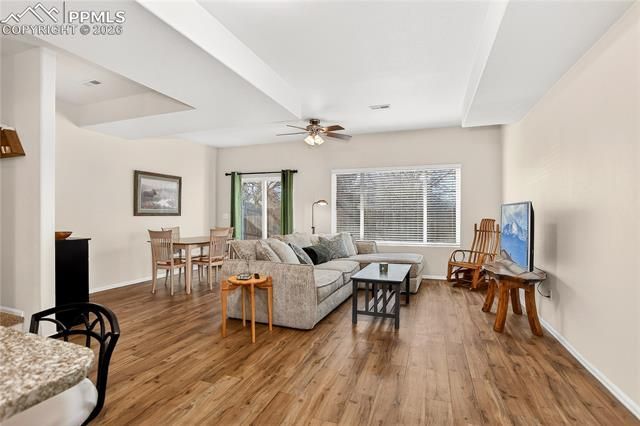Move-in ready townhome, in one of the best locations in the Brant Hollow complex! NO backyard neighbors or tiny driveway! This bright, open 2-story has 9' ceilings and newer LVP throughout most of the main level and features...sunny 12'x17' living room with ceiling fan...adjacent dining area that opens to the fully fenced, shaded back patio...kitchen with ample freshly painted cabinets, coffee bar area, granite counters, glass backsplash tile, SS sink, new decorator light fixture, full wall pantry and all SS appliances including smooth top range...powder bath with pedestal sink...and entry closet with full under-stair storage. Walk upstairs to the cheery 2nd level, and you'll find the...5'x7' loft...12'x14' primary bedroom overlooking the serene trees and peek-a-boo Pikes Peak view beyond; arched entry to the ensuite 5-pc bath with shower with easy-care enclosure, garden tub, double vanity with granite counters, glass tile backsplash, upgraded mirror and new faucets; and 6'x10' walk-in closet...2nd bedroom with ceiling fan and full wall closet...spacious 3/4 hall bath, also with granite counters and glass tile backsplash...and laundry room with included W/D and storage shelf. Outside, you'll enjoy relaxing on the 7'x17' back patio, surrounded by mature trees...garage with overhead storage...and actually being able to park on the full size driveway. Easy access to Powers corridor, Peterson SFB and Shriever AFB. 40 gallon water heater, kitchen cabinets painted ('26); dishwasher, disposal ('25); main level LVP, furnace blower motor ('23), 2" window blinds throughout and 2 window AC units included too!