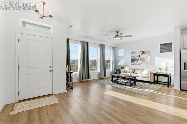 Your search is over ... wait until you see this beauty! Welcome to the Calista- the largest home in the coveted Revel Crossing Community at Wolf Ranch. This stunning better-than-new home is where mountain views and modern comfort blend effortlessly. Natural light fills the open-concept modern style Great Room on the main level, highlighting wide-plank flooring with statement west-facing windows showcasing Pikes Peak in perfect frame. The Gourmet Chef's Kitchen is the heart of it all — crisp cabinetry, sleek quartz counters, SS appliances, a statement backsplash, spacious pantry, & a generous island. The designer tile backsplash & stainless range hood provide a glamorous focal point, with Dining Area adjacent. It flows effortlessly into the 21' living area, where soft light, tall ceilings, & mountain views create a space that feels both expansive & intimate. Outside the dining walkout, the low-maintenance side yard is ready for relaxing evenings or quiet mornings with coffee. A powder bath perfect for guests & 2 car garage, add everyday convenience & storage, completes the main level. Upstairs, step through the bright bonus loft space into the spacious Owner’s Retreat offering a true escape at the end of the day with your very own mountain views. The en suite 5 pc primary bathroom epitomizes luxury living w/Designer tile, "Super Soaker Shower", dual vanities, & a Spacious Walk-In Closet a designed to handle it all with ease. Two additional spacious bedrooms, full bathroom, and laundry (W/D included) complete this level. *Tankless Water Heater *Radon System *Central Air *9ft Ceilings Enjoy the best of CO Living in Wolf Ranch- scenic trails, parks, picnic areas, & seasonal fishing/kayaking at Wolf Lake. Residents enjoy the Wolf Ranch Rec Center/Pool; conveniently located near hospitals, shopping, dining, & Powers Blvd for easy commuting. This home delivers thoughtful design, luxury finishes, & a lifestyle that makes coming home the best part of your day.