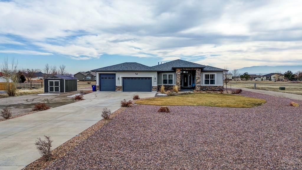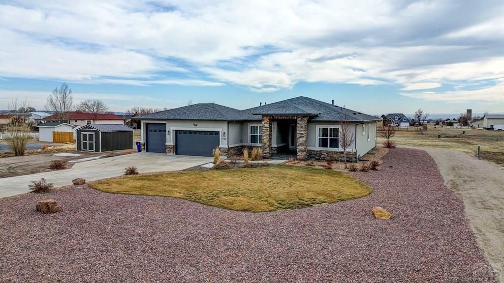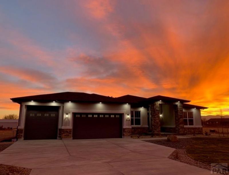 This stunning home in Pueblo West has incredible views and features that impress both in the home and on the property. Approaching the ranch style home you will see a xeriscaped front and back yard using rock and crushed concrete to accommodate the climate. Entering the residence through the beautiful covered front porch the grand scale of the home draws you in through the front door as you are met with a gorgeous open concept living, dining, and kitchen area. Large windows allow natural light to flow throughout and capture the beauty of the hardwood floors. The walk-out eat-in kitchen has a large center island with a breakfast bar, lovely stone countertops, spacious walk in pantry, and pristine stainless steel appliances which includes a gas range oven. The main level has two bedrooms and three baths including the master suite and ensuite bath. The master suite walks out to the back patio, features an ensuite bath with split double vanity with stone countertops, modern tub, free standing shower, and spacious walk-in closet. Bedroom two with a second full bath, a home office with barn door for entry is currently being utilized as another bedroom, laundry room, and a half bath finish out the main floor. The basement features a large family room with large wet bar, perfect for entertaining. Bedrooms three and four with another full bath finish out the basement. The back of the home is just as impressive with a large covered patio perfect for summer bbq's and new 10x20 shed.